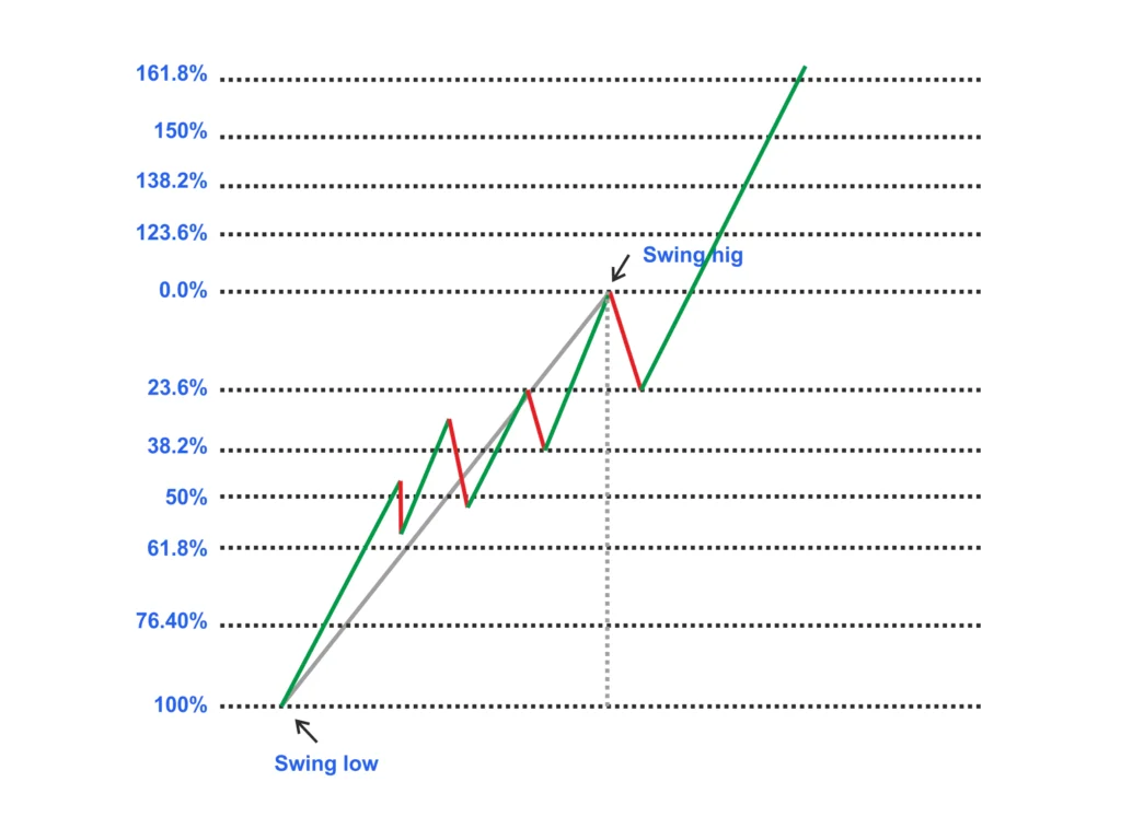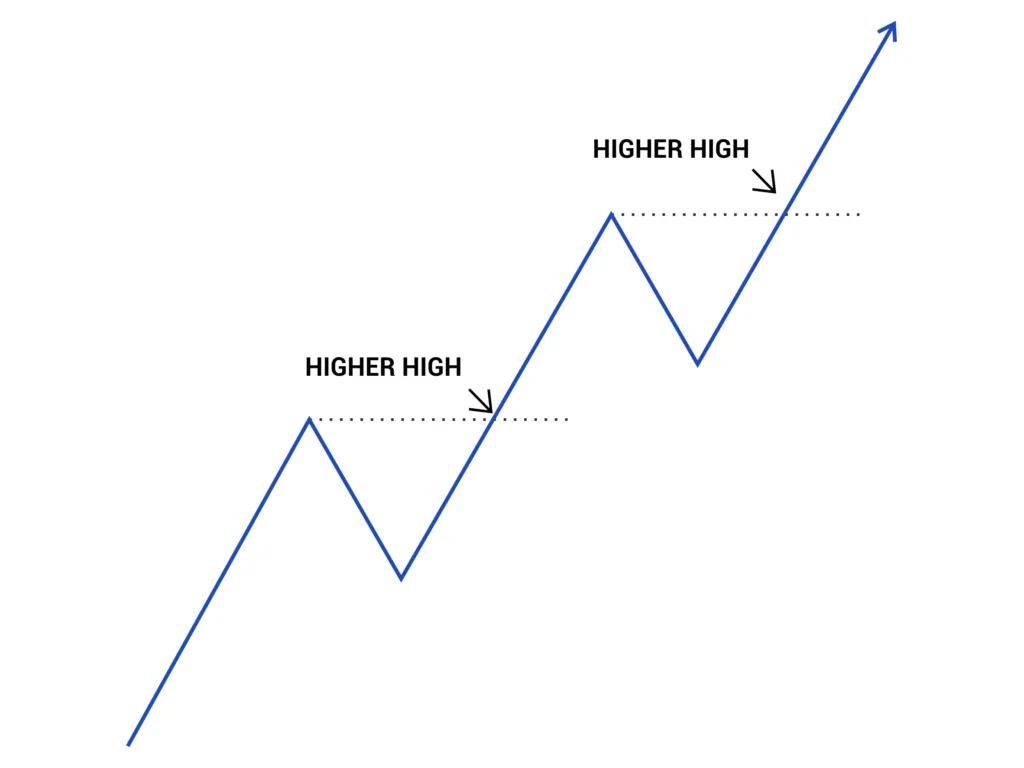 A rising bull market rarely climbs in a straight line. It is interrupted by moves against the trend as some traders take profits. Prices rise and fall in a zigzagging pattern. A rising trend is characterised by a pattern of higher highs and higher lows. A declining trend is defined by a pattern of lower highs and lower lows. As long as this pattern remains intact, we have a rising or falling trend.
