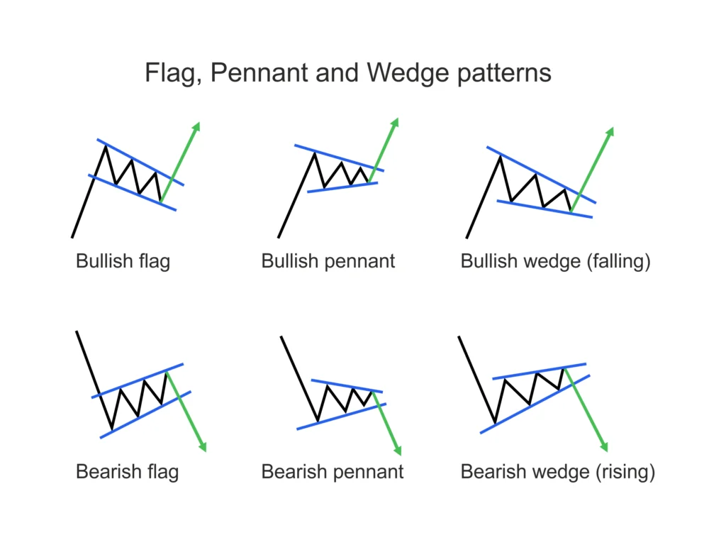 A Wedge can be a continuation or a reversal chart pattern. Wedges look like Flags and Pennants, but Flags and Pennants tend to be only continuation patterns. Therefore Pennant, Wedge and Flags are continuation patterns, but a Wedge is sometimes a reversal pattern.