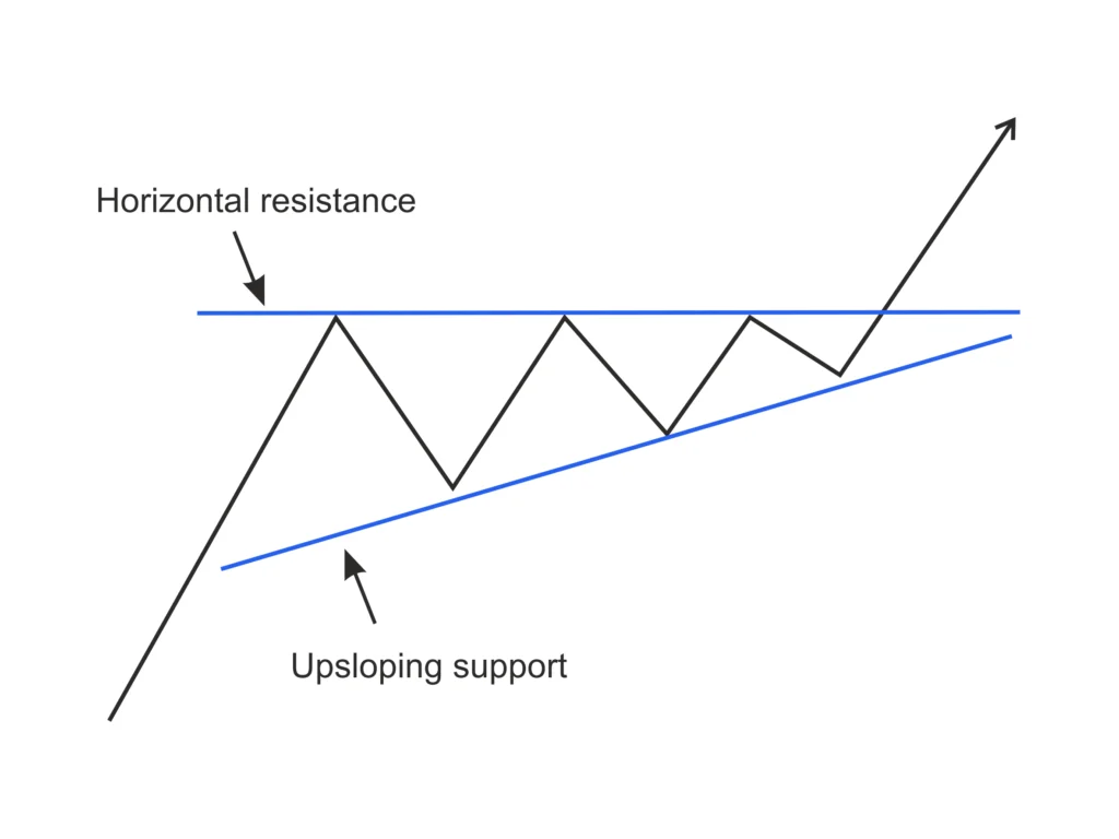 Ascending triangles are most often bullish and usually a continuation pattern in an uptrend. Sometimes they can be reversal patterns at the end of a downtrend, but they’re usually accepted as continuation patterns. The pattern shows us that resistance is building up, pushing against a horizontal price level, as the bulls are getting stronger and forming higher lows. The rising support line and the horizontal resistance line should have at least five points on them before you have the confidence to label the pattern an ascending triangle. There could be three points on one side and two on the other or three on one side and three on the other but at least five pivot points in all. Otherwise, it is too risky to assume it is an ascending triangle as it may just as well be something else.
