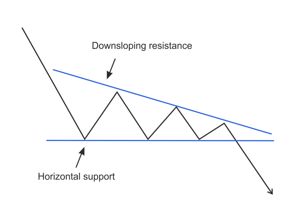 A descending triangle is usually a continuation pattern. A descending triangle is the opposite of an ascending triangle. A series of horizontal lows form a support level, and above it are declining highs as the sellers become more aggressive.