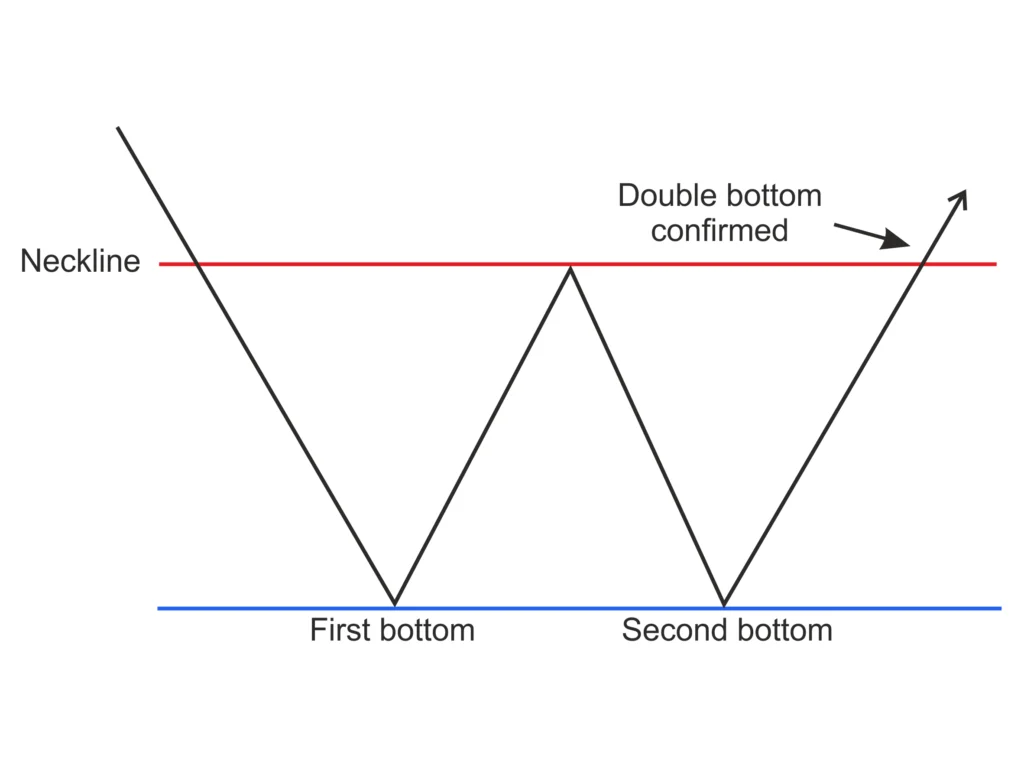 A double bottom following a downtrend is a bullish reversal pattern. The pattern is made up of two consecutive lows at roughly the same price with a pullback in-between. The chart pattern completes when the price breaks above the pullback high – and not before. The pullback high was previously resistance and once broken becomes support if there is a retest of the breakpoint. Look for a rising volume following the breakout to give confidence it will continue.
