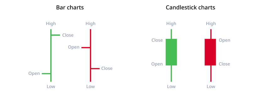 Bar and candlestick charts look different, but show the same information: