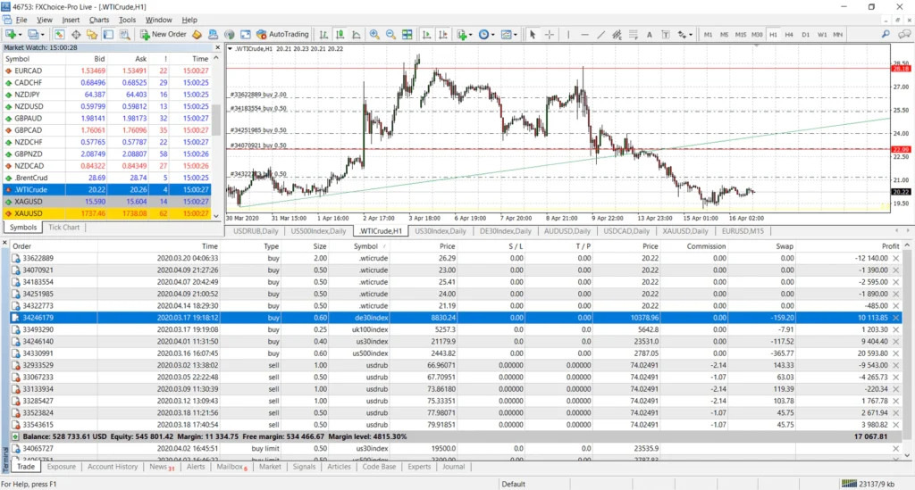 The client terminal permits traders to perform trading operations right on the symbol’s chart. Combined with a one-click trading function, this enables users to open, modify and close positions quickly, and manage Pending Orders.