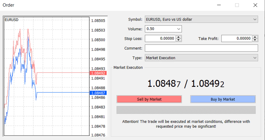 At the top of the image, we can see the symbol you are going to trade (EURUSD in this case). Always ensure the pop-up is showing the desired symbol because if it is unavailable, another symbol takes its place.