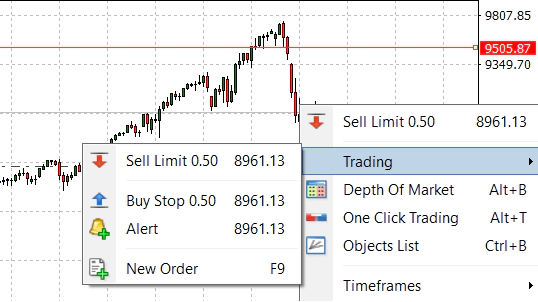 You can place a Pending Order directly on a chart. To do so, right-click on a candlestick or bar where you would like to place the order and select the appropriate type under ‘trading’, as shown below. The volume for the orders placed is selected via the quick trading panel on the chart. If you set Take Profit or Stop Loss orders, you can change them on a chart too. To do so, just drag them to the desired level. Important: The ‘Show trade levels’ option in the terminal settings should be activated to change Pending Orders on the chart.